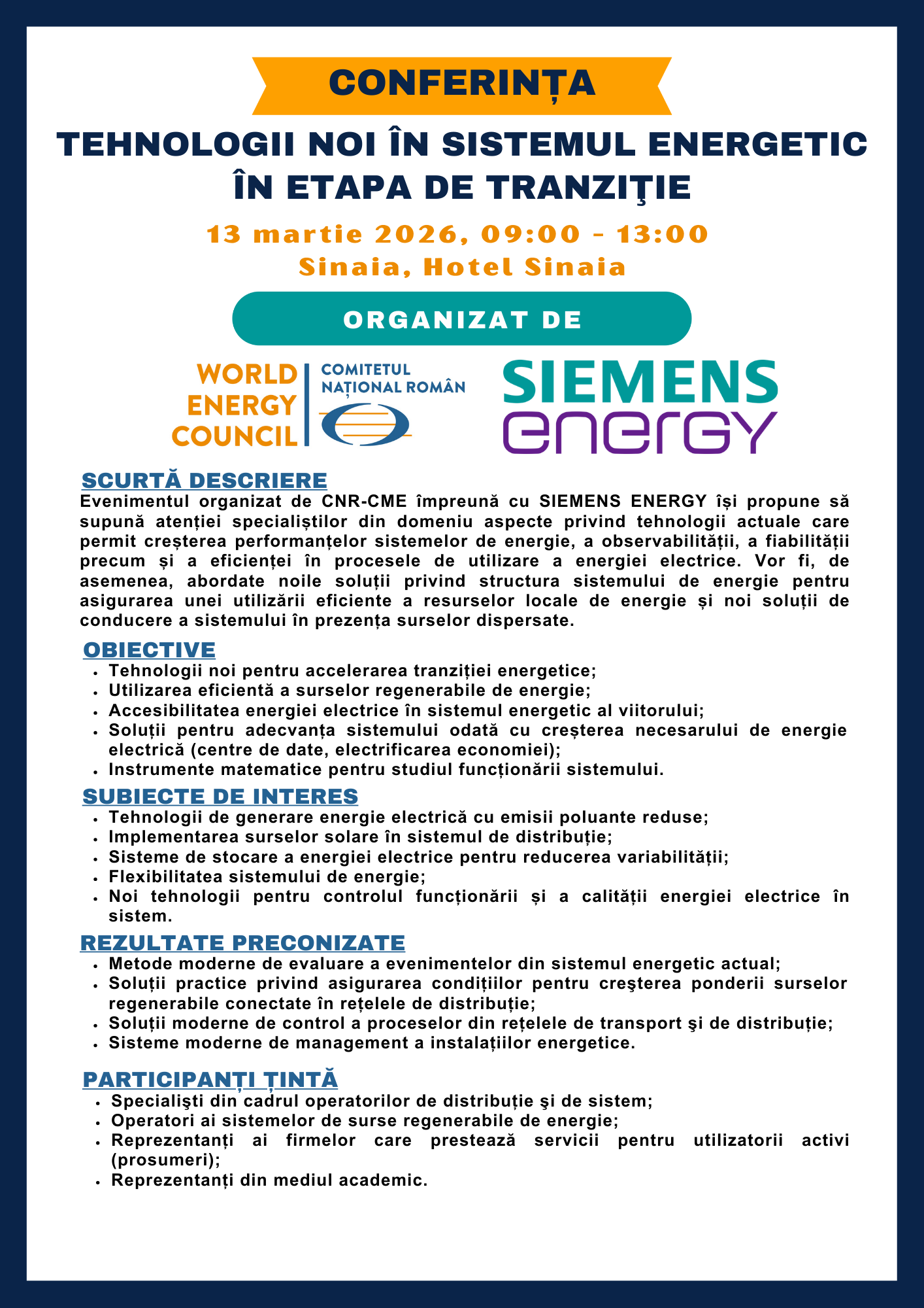 The event organised by World Energy Council Romania, together with SIEMENS ENERGY, aims to draw the attention of specialists in the field to aspects regarding current technologies that allow the enhancement of energy system performance, observability, reliability, as well as efficiency in the processes of electricity use. New solutions regarding the structure of the energy system to ensure efficient use of local energy resources and new system management solutions in the presence of distributed sources will also be addressed.