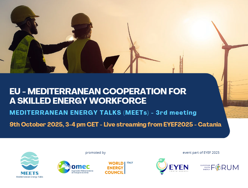 The Mediterranean energy transition is no longer a distant prospect; it is unfolding now and demands new skills, innovation capacity, and structured regional cooperation. In its third meeting, the Mediterranean Energy Talks (MEETs) initiative, promoted by OMEC and WEC Italy, turned to a decisive enabler of this transformation: developing a qualified, diverse, and future-ready energy workforce. Organised in the context of the European Youth Energy Forum 2025 of Catania, the talk will explore how Euro-Mediterranean collaboration can strengthen education, training, and inclusion, while empowering youth and women to play a leading role in the sector.