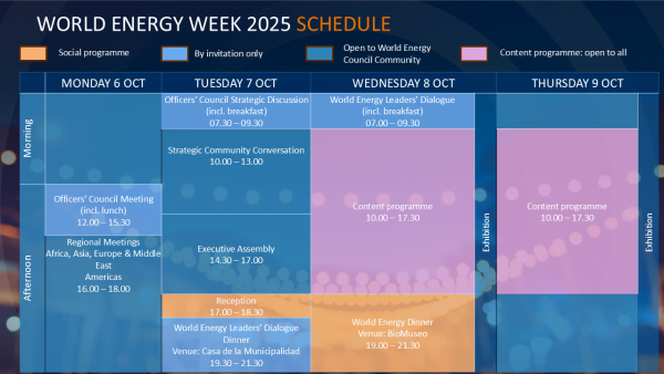 Kicking off 6 October with meetings of the World Energy Council's global members, World Energy Week Continues with a welcome reception for all attendees on 7 October followed by two days of powerful programming and engaging networking and cultural events.