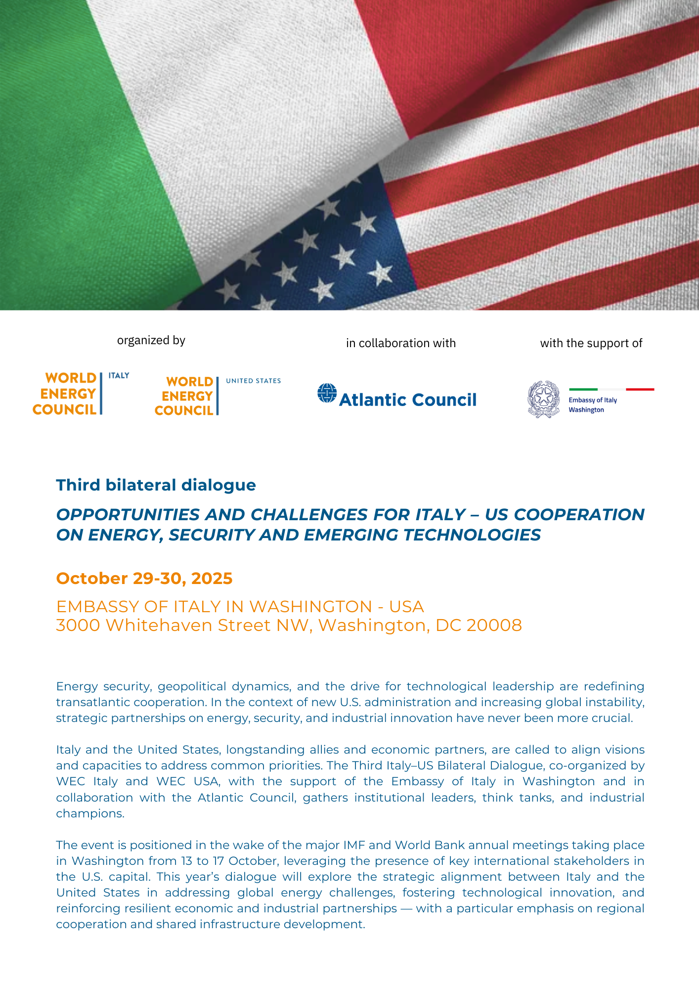 The third edition of the Bilateral Dialogue on Opportunities and Challenges for Italy–US Cooperation on Energy, Security and Emerging Technologies, organized by WEC Italy and WEC US with the support of the Embassy of Italy in Washington D.C. and in collaboration with the Atlantic Council, took place on October 29–30, 2025, at the Embassy’s headquarters.