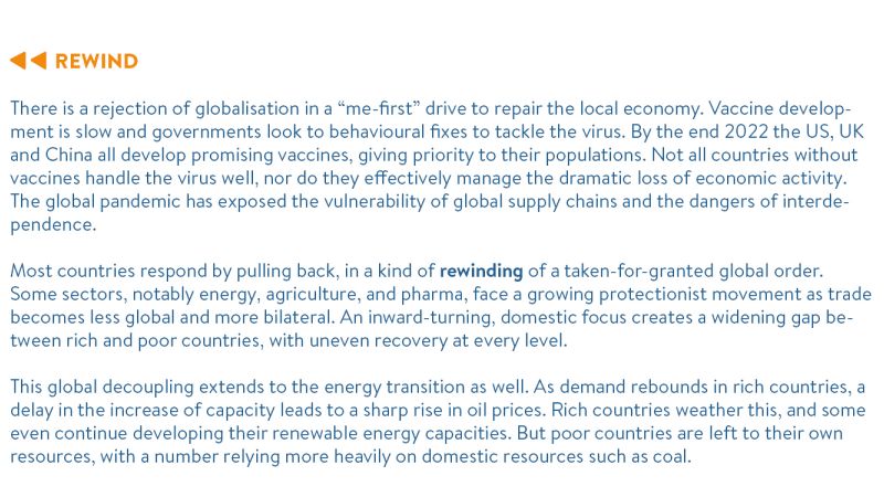 To assist our global energy community, the World Energy Council has developed four plausible scenarios to 2024 – Pause, Rewind, Fast-Forward and Re-Record – that can be used to stress and design recovery strategies. Each scenario explores three critical uncertainties – ambition, trust and ability to control the virus – and how these combine to shift the pace and direction of global energy transition.